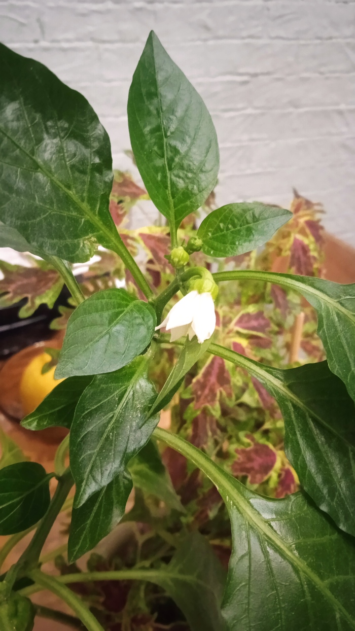 Это огурчики в правом горшке. На фото их два, на самом деле их штук 8+ (из каждого листка есть плодик).
