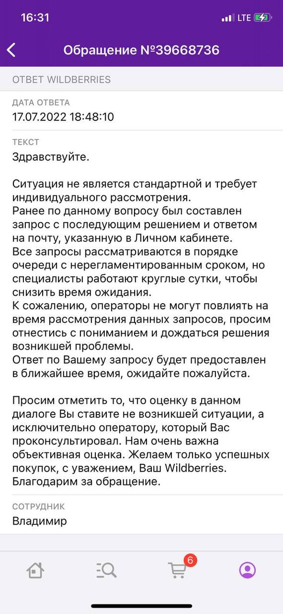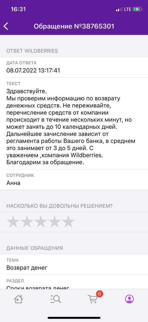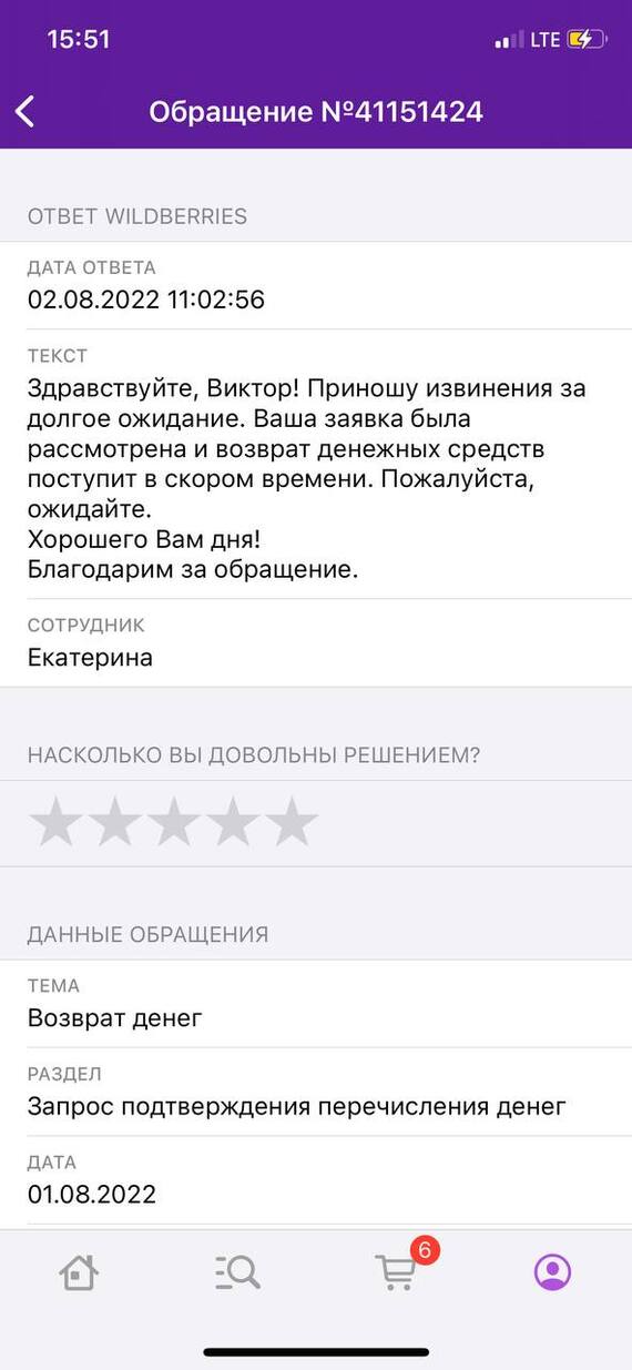 Но к сожалению деньги за первую продавец почему то решил, что возвращать не обязательно, хотя прошло уже больше месяца. Написал несколько обращений, но ответ один, ждите, обязательно решим. В самом пункте выдачи, администратор сказала что это проблема только на стороне продавца, а сам Вайлдберриз здесь ни причем и никакой ответственности за возраст средст не несёт
