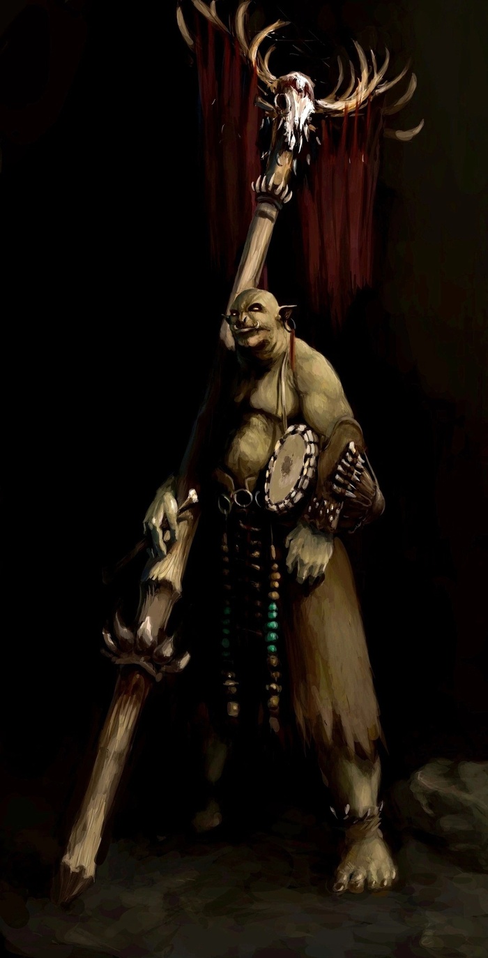 Перейдем к более сложному. В конкурсных работах кого только мы не встретили на роль жезловика фракции. Но у всех была общая черта: жезл этих персонажей представлял собой некий тотем, будь то деревянный тотем шамана или говорящего с духами, или же каменный тотем огра. Всё сошлись в одном - жезл фракции это тотем, обозначающий звериное начало зеленокожих и их связь с духами. И здесь мы согласны с вами. При выборе же персоналии герою-жезловику мы руководствовались тем, что у каждой фракции они особенные и отражают одну из ключевых особенностей той расы, которой принадлежат. Мы рассудили, что жезловиком будет огр. Первый герой в игре, что будет занимать две клетки! Его жезл-тотем и станет его же оружием.