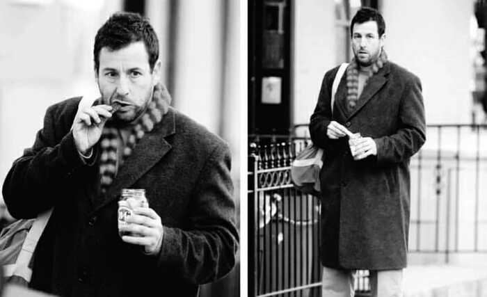 Увидел в интернете фотографию, на которой Адам Сэндлер идёт в пальто по улице и ест из банки консервированные огурчики.