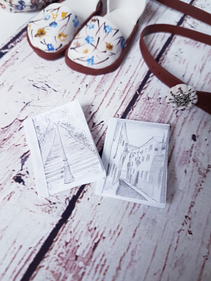 Шила я только в детстве на уроках труда, то есть знаний в этой области мало. Посмотрев пару простых видосов о выкройках, быстро наклепала парочку для моей красавицы. Получились отвратные широкие штаны и кривая футболка, а чуть позже это полосатое платье и тонкий кардиганчик (или как эта штука называется, знатоки поправят). К слову, одежду ей шила из собственных старых тряпок, которые больше не ношу. Пояс, туфельки и сумку сделала из полимерной глины (рисунок на сумке и туфельках — акриловая краска). Помимо этого, уменьшила мной же нарисованные картинки и распечатала в качестве обложек на тетрадки, которые теперь лежат в сумке.