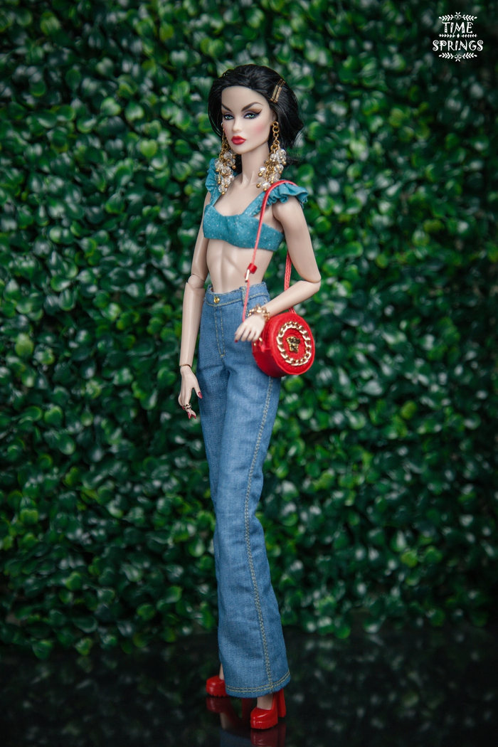 Кроп-топ с бретелями-крылышками из тонкого батиста, на подкладе, застёжка на кнопку + джинсы-клёш на высокой посадке.