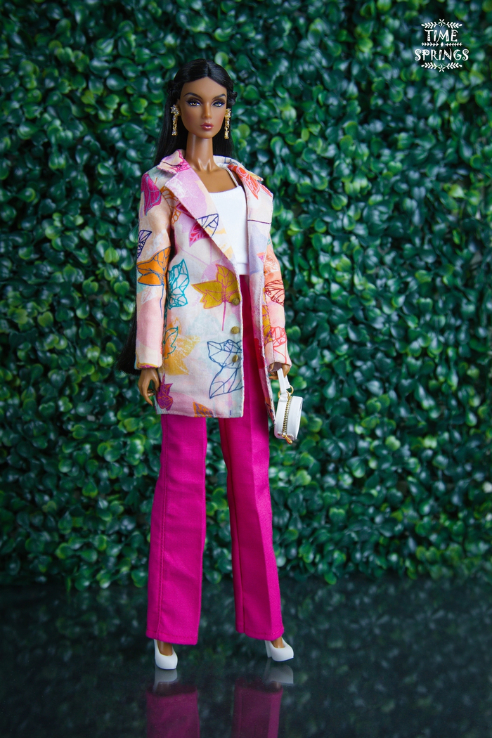 Серый брючный костюм с контрастным "акцентом" на мой вкус, отдаёт немножко пижамным стилем. Видимо, в этом виноват розовый полисатин😁