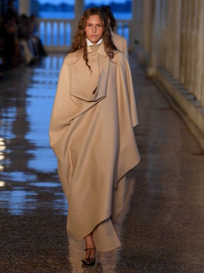 Такой сложный крой в тренде уже несколько сезонов подряд. Фасон хорош своей оригинальностью. Создает драпировку и защищает от ветра. (Max Mara)