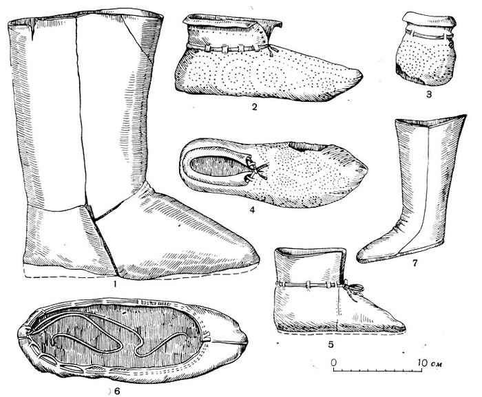 Основные типы обуви: 1 - сапог, 2 - ажурная туфля, 3, 4 - вид той же туфли сзади и сверху, 5 - детская простая туфелька, 6 - поршень, 7 - полусапожок. Новгород. (Коллекция НАЭ. С. А. Изюмова. К истории кожевенного и сапожного ремесел Новгорода Великого. МИА, № 65, стр. 212, рис. 8).