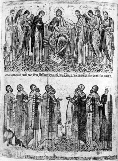 Молящиеся новгородцы. Икона в Новгородском музее. (В. Н. Лазарев. Искусство Новгорода. М. - Л., 'Искусство', 1947, табл. 110).