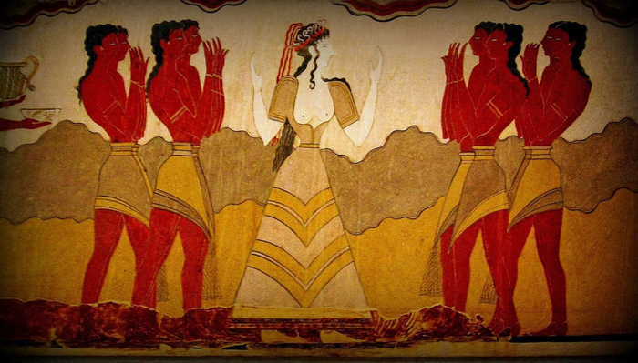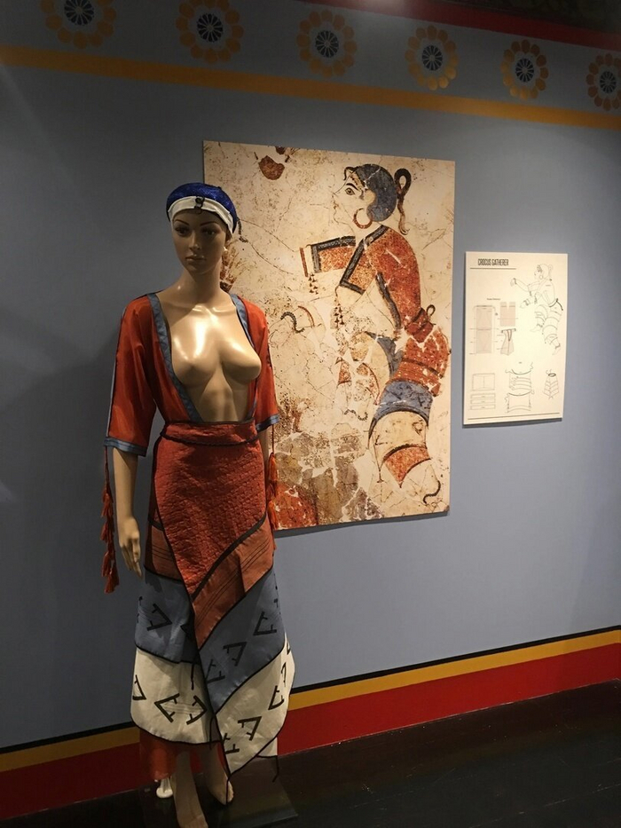 Поговорим об одежде минойских женщин. На большинстве найденных фресок видно, что женщины на Крите носили платья, скажем так, свободного кроя. Грудь практически целиком была открыта.