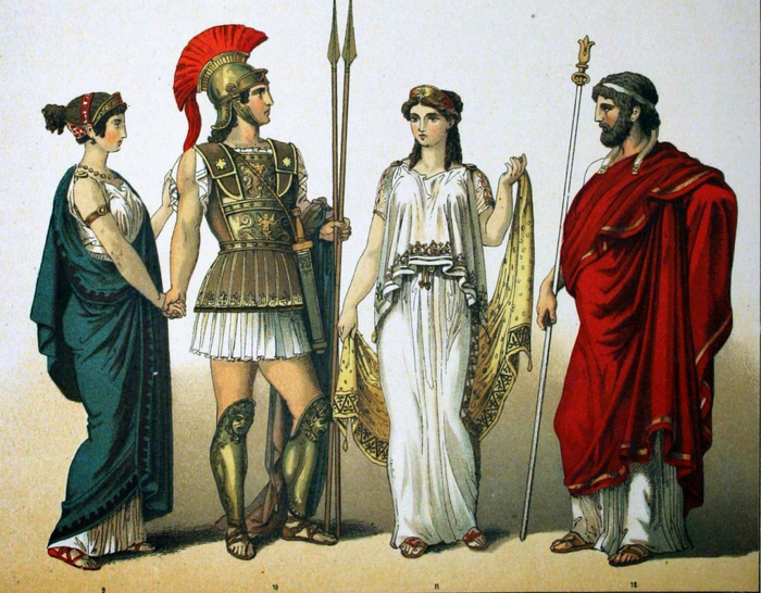 Однако интерес представляют не только пышные формы миноек, но и фасон платьев. Сравните костюм критянок и более поздний хитон времён классической Греции. Хитон - просто обмотанная вокруг тела ткань, закреплённая в нескольких местах.