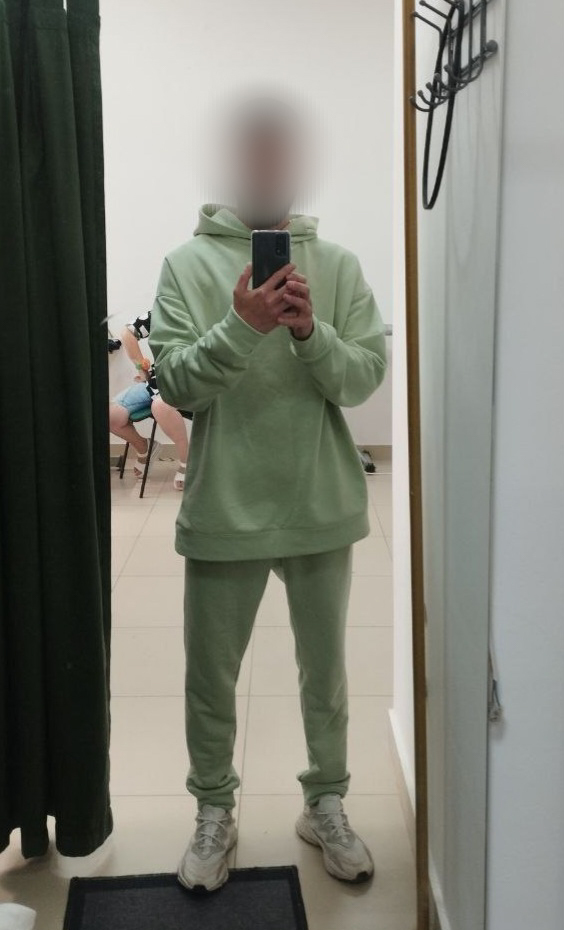 Разработка лекал и изготовление заняли какое-то время, но, в конечном итоге, мы получили сначала образец из трёхнитки, который был ничего, но требовал доработок, в основном по части брюк. На фото именно он на Пашке.