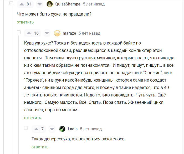 В коем то веке забрался сюда, и вижу... одни с яйцами, другие без. И всем кругом плохо. И все так, блин, в тему. Ну окей, значит поехали, видимо знак. Будет и моя кулстори