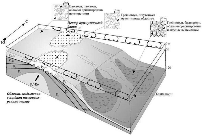 3D-модель эоценовой нуммулитовой банки в Крыму — реконструкция шельфового участка океана Тетис, где обитали и умирали нуммулиты, формируя «банки» на наиболее возвышенных и мелководных участках дна, приуроченных к области тектонического поднятия (воздымания). В квадратиках показаны различные литологические типы карбонатных пород по классификации Р. Данхема (см.: Dunham classification), по которым можно судить о тех условиях, в которых они формировались. Слева направо: шельфовая лагуна, отмели в пределах «банки», внешний шельф. Рисунок из статьи Л. Ф. Копаевич и др., 2008. Крымская эоценовая нуммулитовая банка
