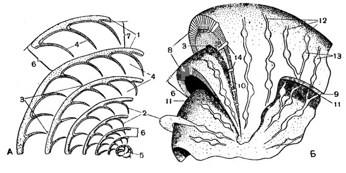 Схема строения раковины нуммулита: А — экваториальное сечение, Б — вид сбоку. 1 — спиральная полоса; 2 — септы; 3 — устье; 4 — камеры; 5 — начальная камера; 6 — высота оборота или шаг спирали; 7 — высота канала; 8 — спиральный валик; 9 — боковые стенки оборотов; 10 — боковые продолжения септ; 11 — боковые продолжения камер; 12 — следы септ; 13 — гранулы (элементы наружной скульптуры); 14 — столбики гранул. Рисунок из книги «Основы палеонтологии», 1959