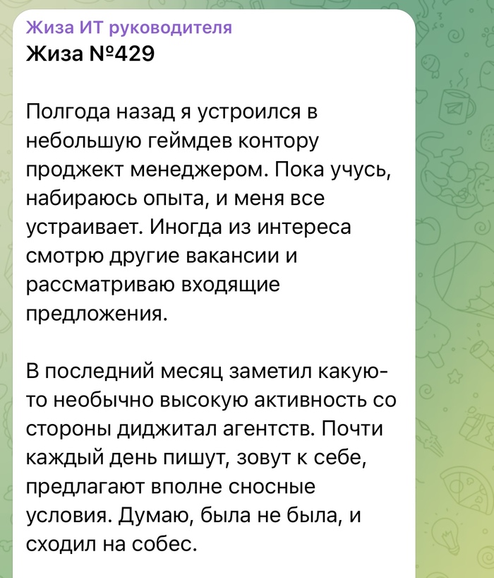 Решил сходить на собеседование. Договорились о времени, но не тут-то было. Сначала выяснилось, что к этому же времени пригласили ещё кучу людей. Меня же пустили только в предбанник, следующую комнату после длинного коридора, где предложили ещё подождать. Я присел было на стул, но женщина, сидящая за компьютерным столом стала со мной разговаривать и задавать вопросы. После выяснилось, что это обычная секретарша проявляла любопытство и от балды крутила демо-версию собеседования.