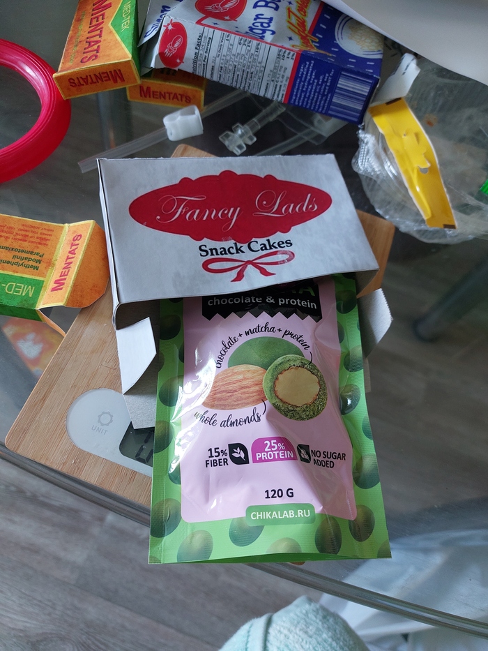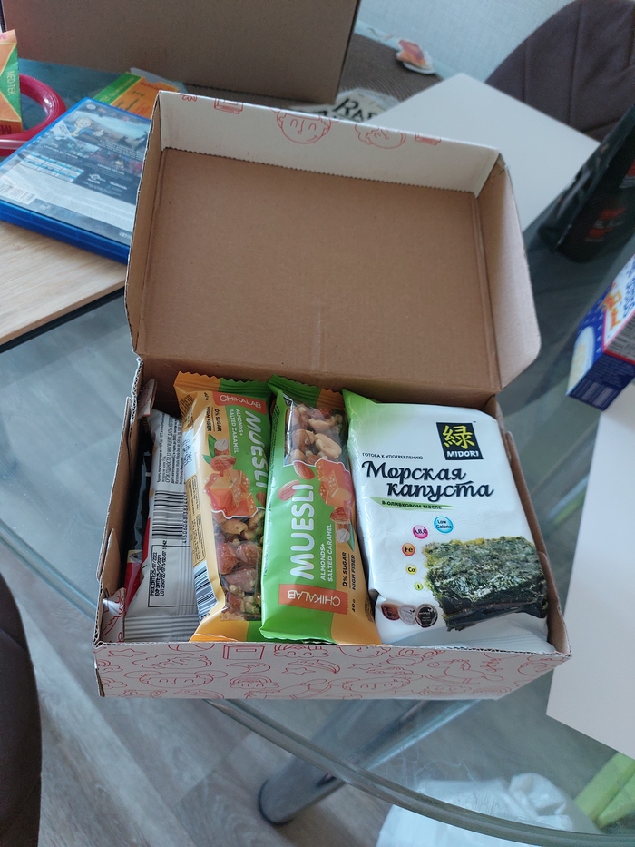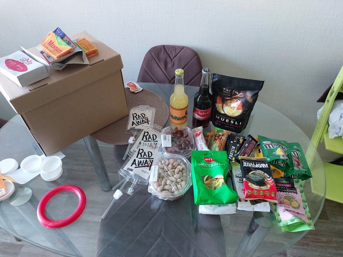 Изначально планировал меньше все, но когда закупил вкусности, понял что не хватает. Решил просто упаковать в подарочную помятую дочерью бумагу, сверху эмблемка. Коробка от детской обуви.