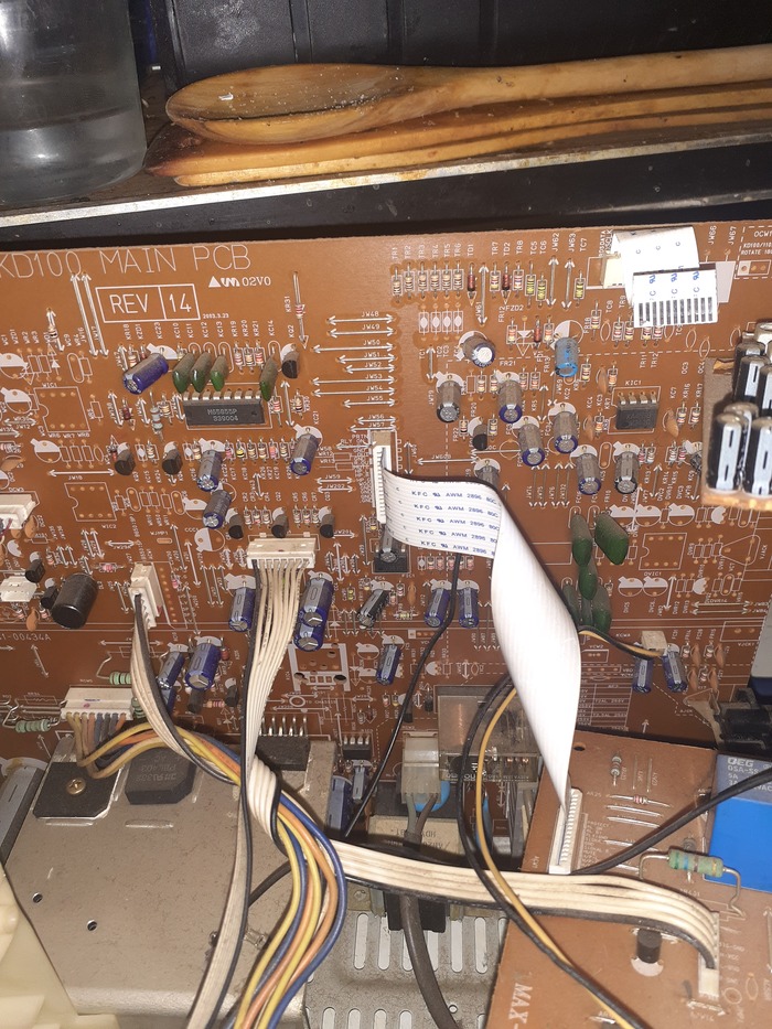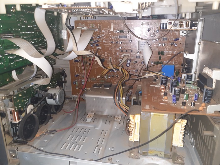 Произвёл чистку оптики диска - диски зачитал , замену конденсатора на правом канале - усилитель полностью заработал , произвёл чистку линейного входа от застрявшего обломка штеккера тюльпана (самое сложное - весь пришлось разобрать и молотком выбивать😁), произвёл замену сгнившего пассика в кассетной деке по гандоновой системе , чистку головок , прижимных роликов , тон валов - обе деки заработали одна даже с "открытым ртом" , сделал антенну для радио из проволоки .