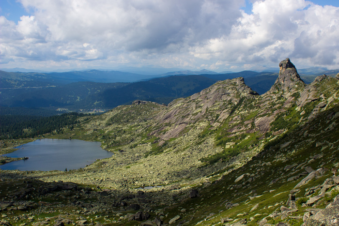 После небольшого набора высоты выходим к озеру Радужному, тут открывается вид на гору Спящий Саян, скалу Орешек и Висячий Камень. Одновременно пришла группа туристов однодневщиков, поэтому задерживаться не стали и двинулись дальше через первый перевал - набор высоты не большой, но подъем крутоват.