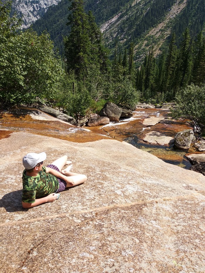После вкусного обеда идем посмотреть на водопады и Малахитовые ванны, которые образует река Тайгиш, вытекающая из озера Художников.