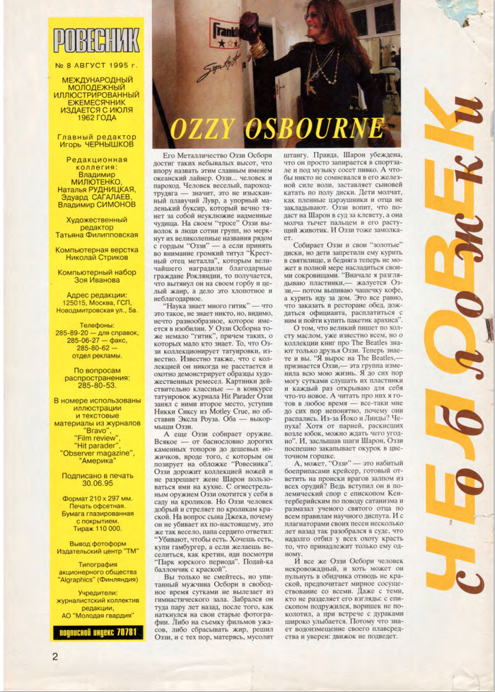 В связи с шумихой вокруг Оззи Осборна вспомнил как я про него вообще узнал... В журнале Ровесник. №8 за 1995 год.