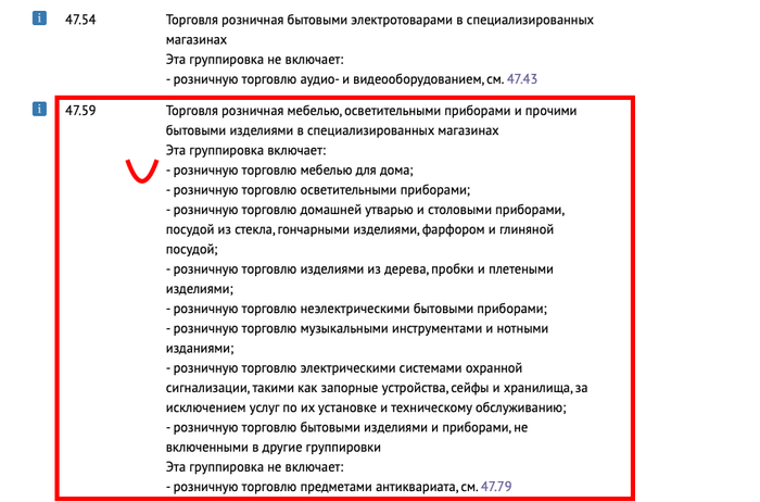 Вы будете не только производить мебель для кухни, но и продавать её клиентам. Поэтому нам нужен код ОКВЭД, разрешающий заниматься продажей мебели в розницу. Это код 47.59 «Торговля розничная мебелью».