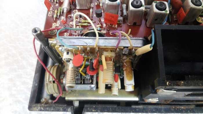 Начинаем с модуля УКВ, перестраиваем контура, включаем, приёмник молчит. Вообще на УКВ звуков не издаёт. Берём эталонный, вставляем в него плату, тоже тишина. Виновником оказался один из транзисторов, у которого со временем h21э скатился с 200 до 25... Заменили. На эталонном звук пошёл. Возвращаемся к пациенту. На нём всё так же тишина. Делаем профилактику усилителю, проверяем переменники. Все диапазоны работают, УКВ нет... Видите, катушки УКВ не залиты воском?) либо их не настраивали, либо сердечники выкрутились от времени. Странно...
