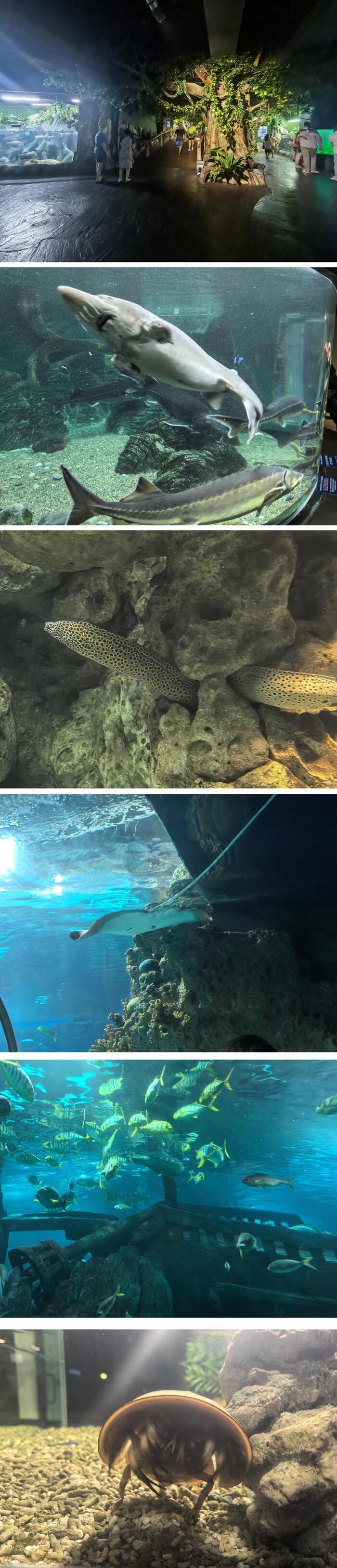 В главном корпусе установлено 135 аквариумов для 500 видов рыб и млекопитающих: посетители увидят медуз, осьминогов, звёзд, кальмаров и т.д. Также посетители могут пройти через 70-метровый подводный туннель для посетителей — полюбоваться морскими обитателями с разных ракурсов.