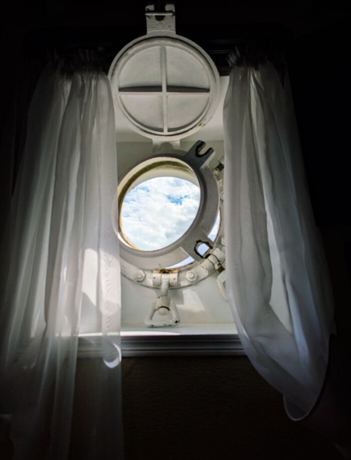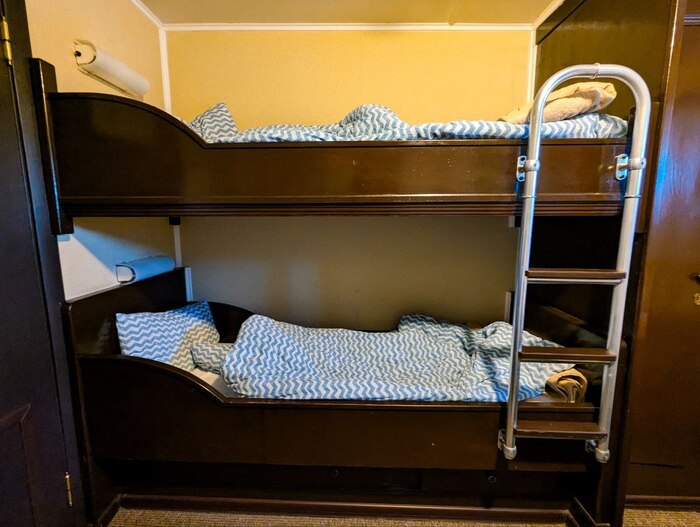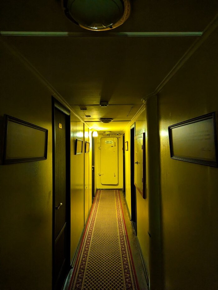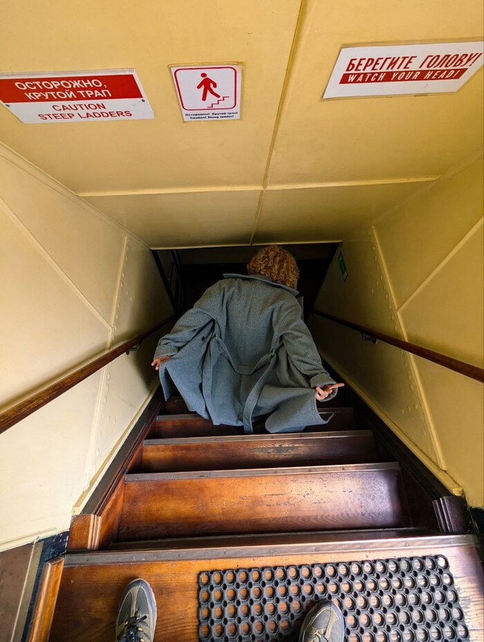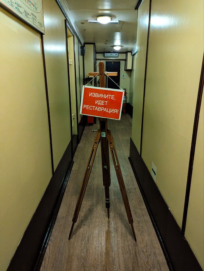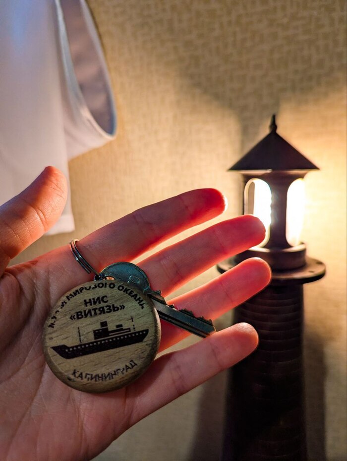 Да, он никуда не пойдет, и максимум что тут от морского это легкая качка. Но внутри все очень аутентично. Получаем ключи от каюты, слушаем инструкции по поведению и на случай выхода с судна. Все довольно строго, работают бывшие и действующие моряки.