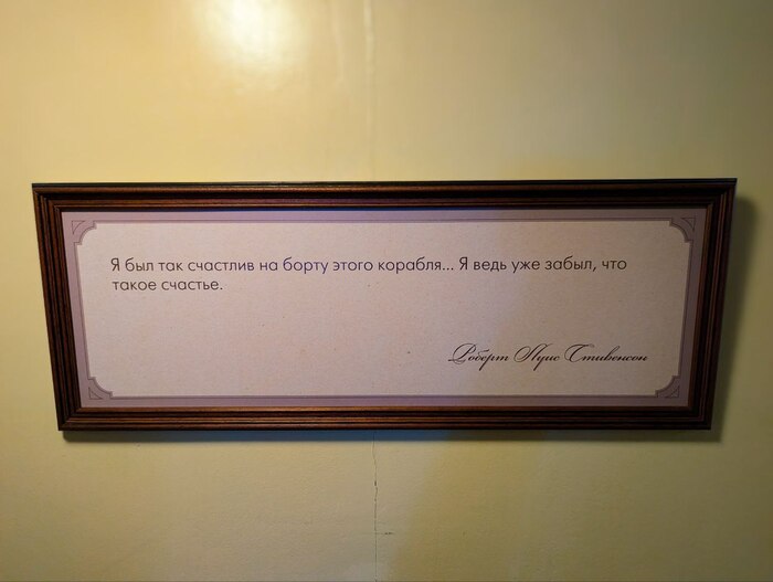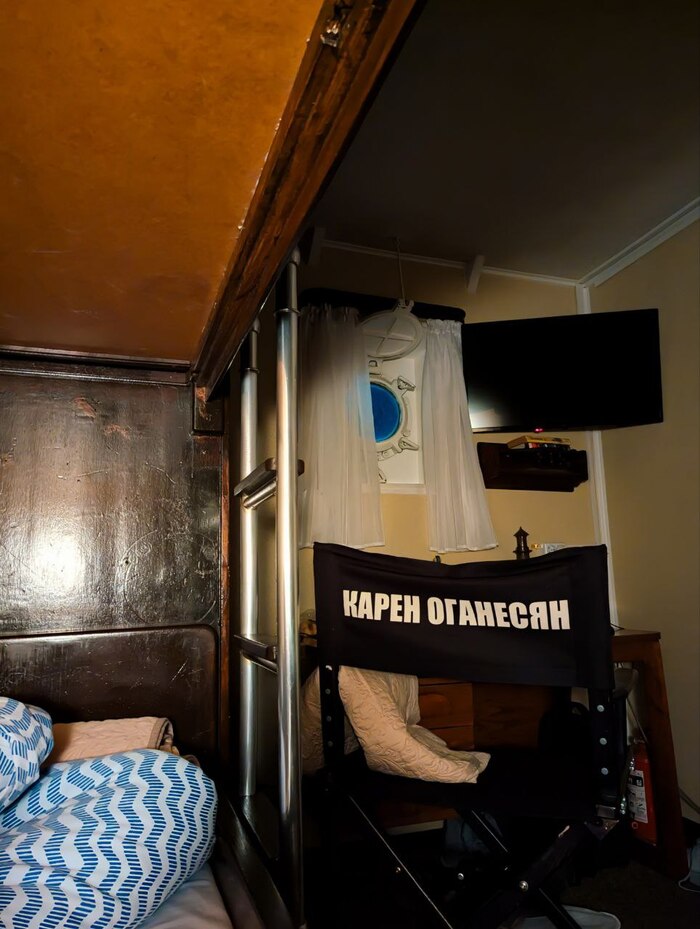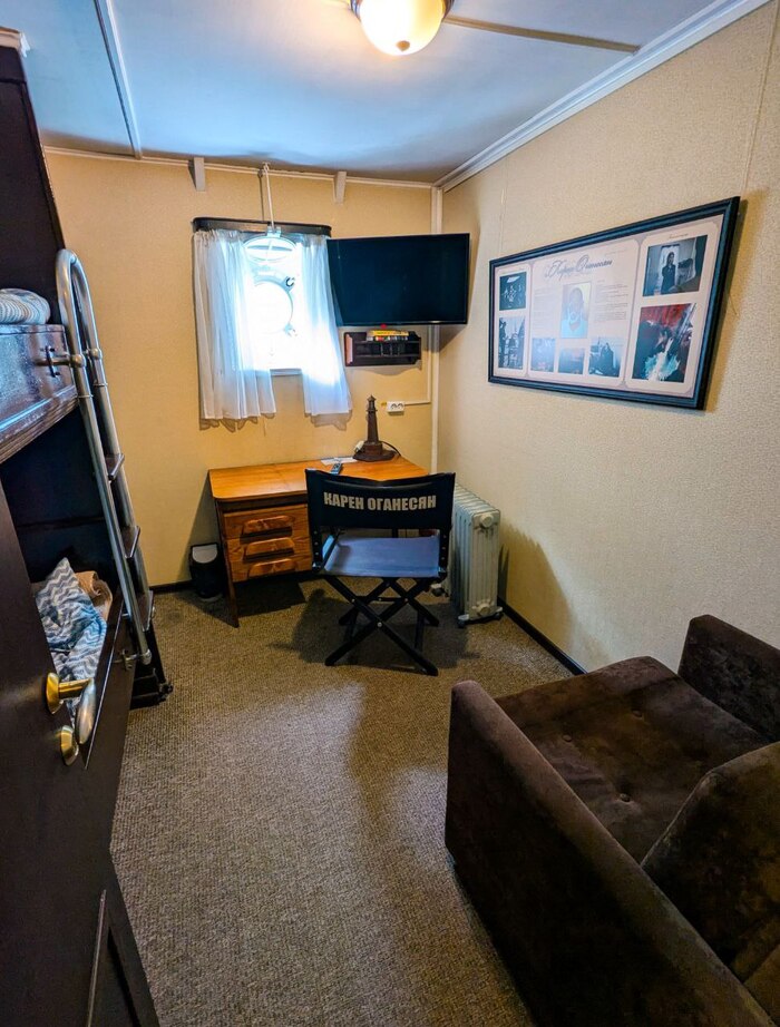 Первым делом осмотрим место пребывания. Каюта совсем небольшая и тематическая. Есть больше и, допустим, посвященные Жюль Верну, Эрнесту Хемингуэю, но мне досталась последняя свободная на эти даты, имени Карена Оганесяна =D