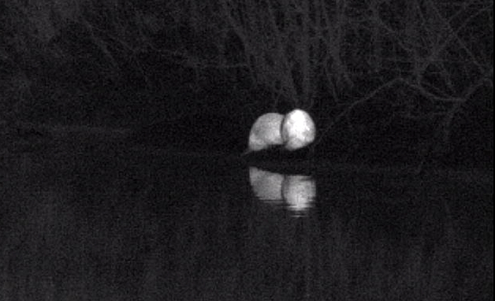 Тепловизор снимает только объекты, излучающие тепло. Первой в объектив мне попалась кошка, которая охотилась на крыс. Грызуны, как только почуяли опасность, бросились в рассыпную. Но меня здесь интересуют не крысы, а самый крупный грызун Европы – бобр, а он появился только ближе к полуночи. А вот и наш герой - объедает кору с осины, которую повалил накануне ночью. В какой-то момент появился второй бобр, и парочка