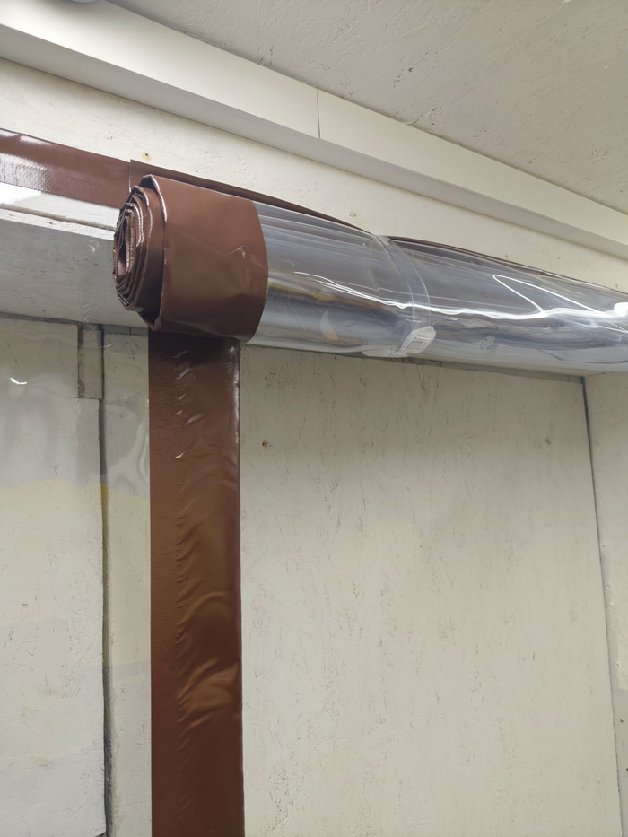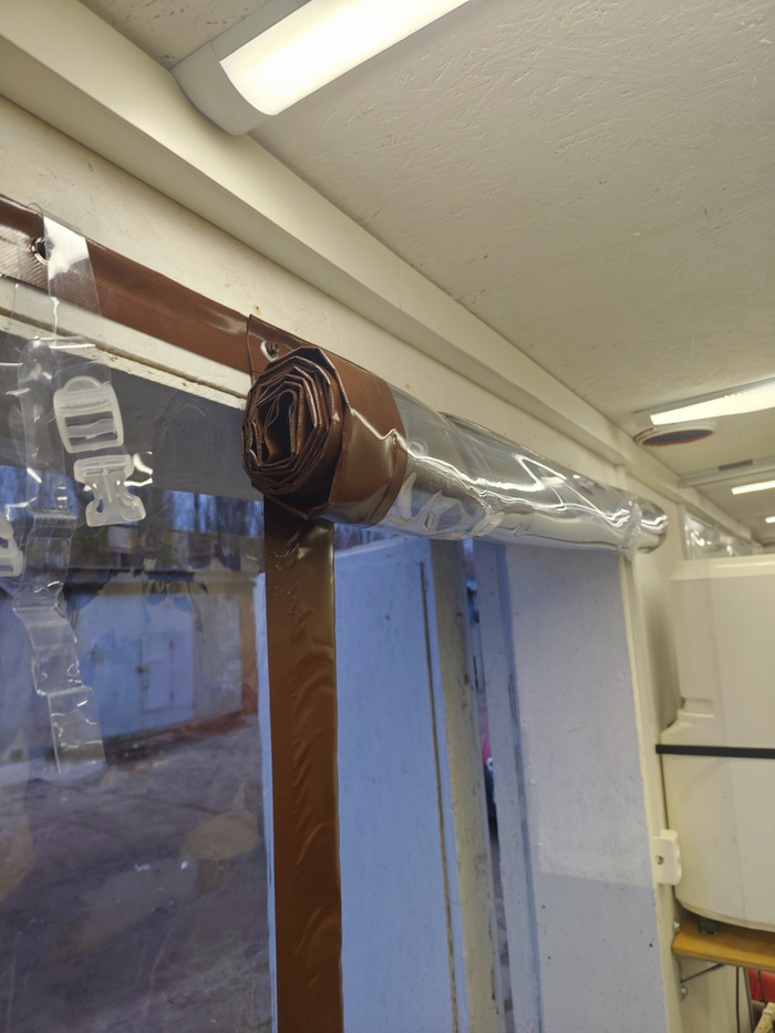 Как ни пытался утеплить ворота, всё равно немного продувается, то есть штора, всё равно, нужна для создания ещё одной воздушной камеры перед воротами, брезент однозначно не хотел!