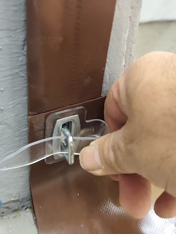 По низу, чтобы штора лучше прилегала к стене, есть 2 крепления скоба/ремень которые открываются за 5 секунд.