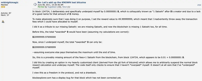 8 июня 2011 года, пользователь форума BitcoinTalk под ником midnightmagic написал, что при добыче блока 124724 он понизил себе вознаграждение ровно на 1 сатоши, выразив тем самым своё огорчение по поводу тогдашнего исчезновения создателя биткоина. «Я сделал это в честь пропавшего Сатоши. Мы потеряли 1 Сатоши и теперь блокчейн биткоина тоже потерял 1 сатоши» — написал пользователь. Вы можете найти блок номер 124724 в любом обозревателе блоков и наглядно увидеть, что в нём и правда было сгенерированно не 50, а 49.99999999 BTC. Таким образом, этот 1 сатоши навсегда исчез из реальности. А если быть точнее, он даже не появлялся!