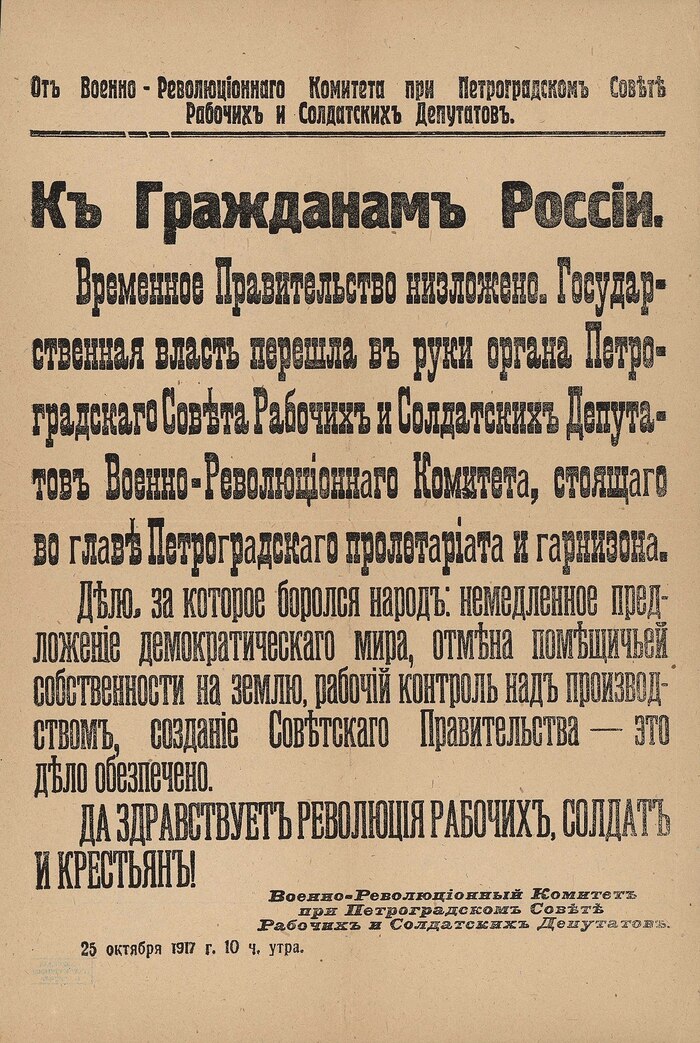Пока брали Зимний дворец, в половине третьего ночи в Смольном институте открылось экстренное заседание Петроградского Совета. На трибуну вышел его председатель Лев Троцкий, который заявил: "От имени Военно-революционного комитета объявляю, что Временного правительства больше не существует! " Далее слово взял Ленин: "У нас будет советское правительство, наш собственный орган власти, без какого бы то ни было участия буржуазии. В корне будет разбит старый государственный аппарат управления и будет создан новый в лице советских организаций... В России мы сейчас должны заняться постройкой пролетарского социалистического государства. Да здравствует всемирная социалистическая революция! "