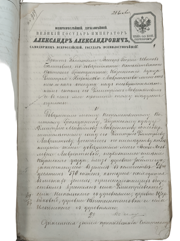 Представляя при сем заявление наше о том, что дети - Владимир, рождённый 22 марта 1882 г. и Антонина, рождённая 8 марта 1885 года, действительно происходят от нас, и прилагая метрическия свидетельства о их рождении, о нашем браке, а также о первом моём - Дмитрия Михайловича Лаврентьева, браке с девицею Анной Яковлевной Немчиновой и о смерти последней - покорнейше просим Окружной Суд, согласно Высочайше утверждённого 12 марта 1891 года мнения Государственного совета, постановить определение об узаконении детей наших - Владимира и Антонины.