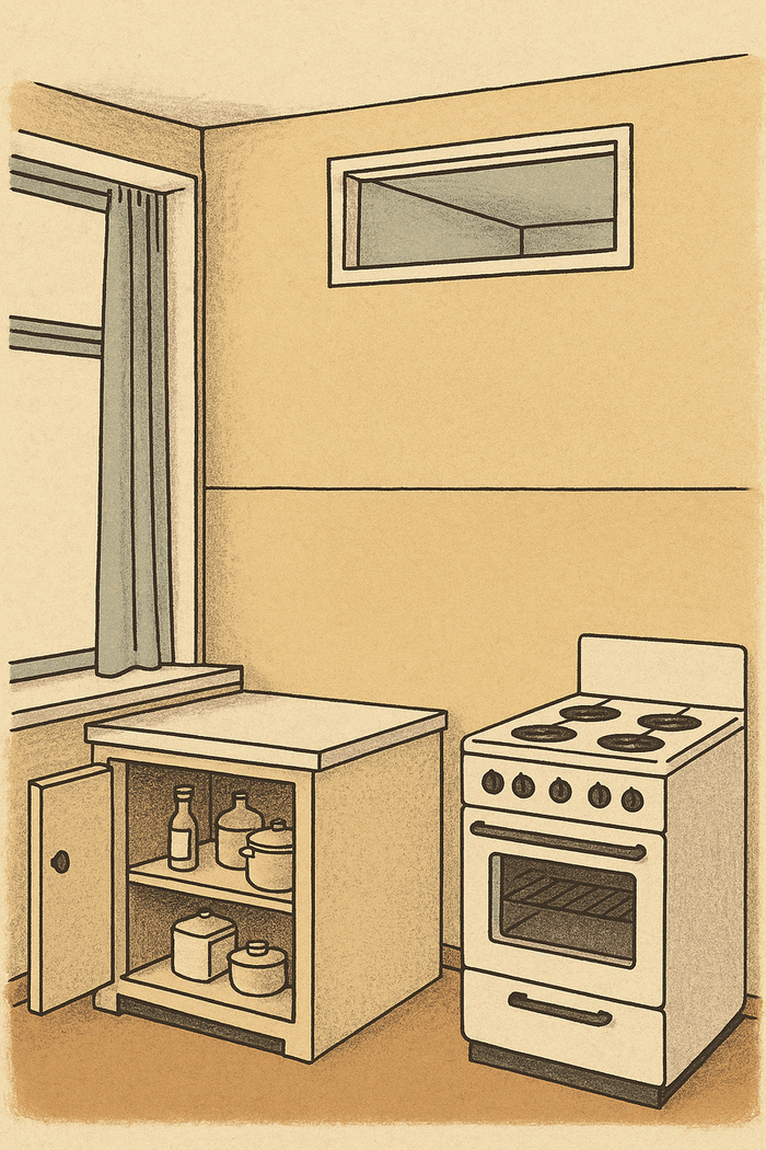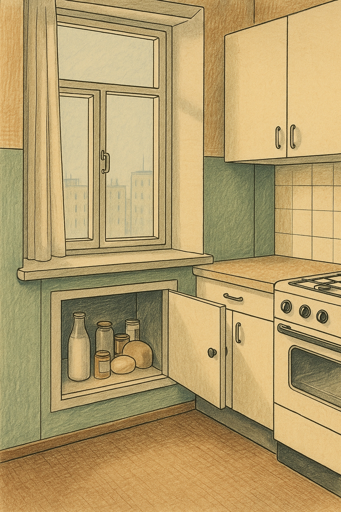 Холодильник под окном. В хрущёвках часто встречалась ниша под подоконником на кухне. Зимой её использовали как естественный холодильник, где хранили продукты, так как электрические холодильники ещё не получили широкого распространения. В летний период ниша выполняла роль обычного шкафчика для хранения.