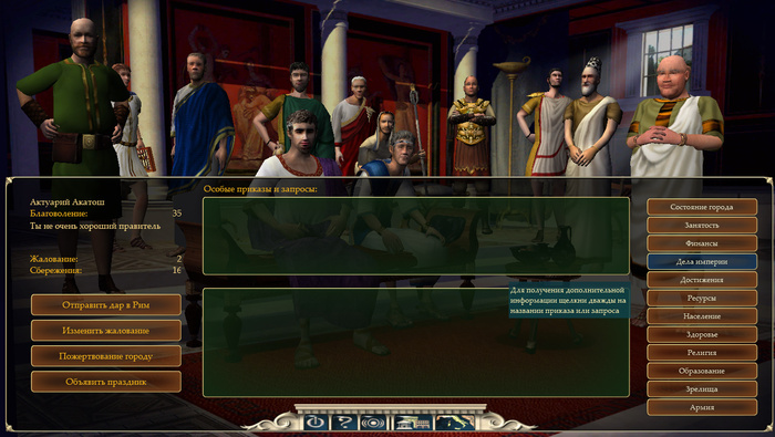 При этом можно сосредоточиться исключительно на создание условий для граждан, или получать благословение императора и надеется на помощь Рима, ну или воевать с другими городами, заключать союзы и так далее