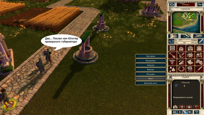 Если подвести итог то наместником быть не так просто. Нужно обеспечить людей едой, развлечениями, медицинской системой, водой и конечно же следить за пожарами и тем чтобы Боги не послали кару на ваш город. При этом то какие будут налоги, где будет построит Коллизей, или с кем предстоит воевать - ваши решения.