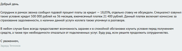 Ну да ладно. Интересно стало, что мне предложат в итоге. Кредит одобрили, и на следующий день позвонили. По телефону мне сказали, что это будет кредит на 500 000 р по ставке 18,03% годовых на 36 мес.