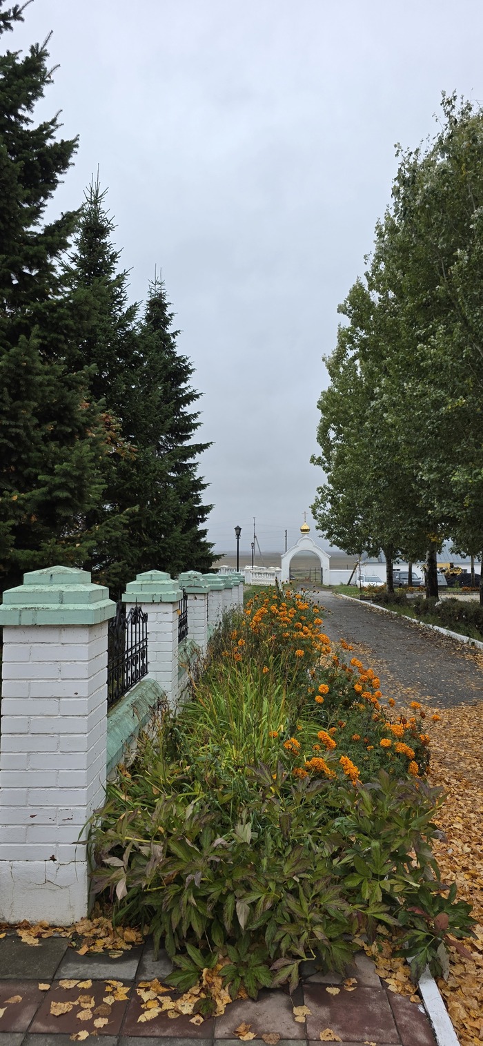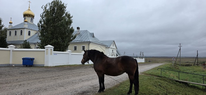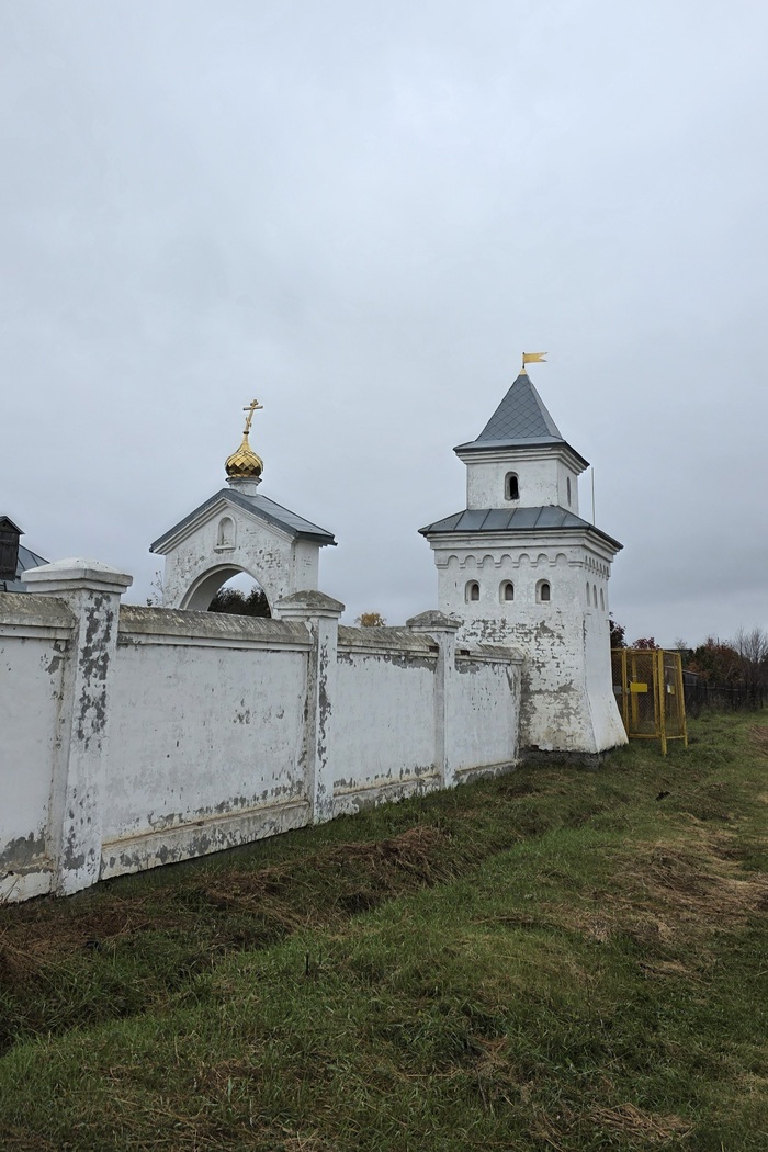 Монастырь издалека выглядел как будто его из центральной части России вдруг к нам в область перенесли. Стоит на небольшом холме, за нам начинается село, вокруг поля и немного деревьев, каменные красивые стены почти как у кремля, блестят даже без солнца купола, рядом лошади пасутся....
