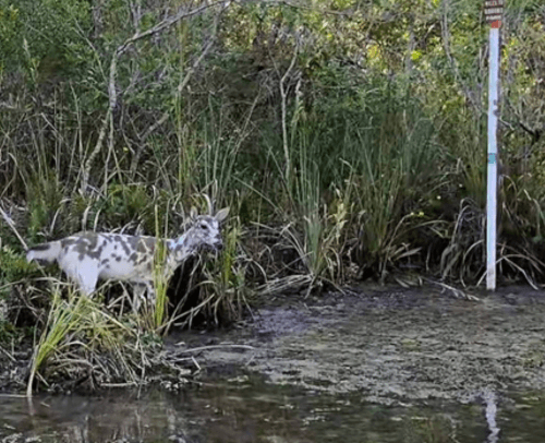 Но одна женщина, плававшая на лодке, повстречалась с удивительным созданием — оленем с эффектным бело-коричневым пегим окрасом. Пегость — это генетическая особенность, которая нарушает выработку меланина, что приводит к депигментации кожи и меха. Её проявление среди оленей считается довольно редким и встречается менее чем у одного процента популяции.