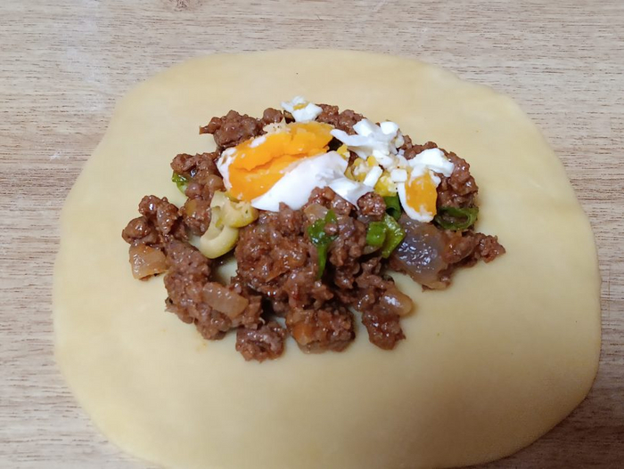 Для начинки отварите яйца и нарежьте кубиками лук. Смешайте говяжий фарш, копченую паприку, молотый кумин, молотый чили, соль и черный перец.
