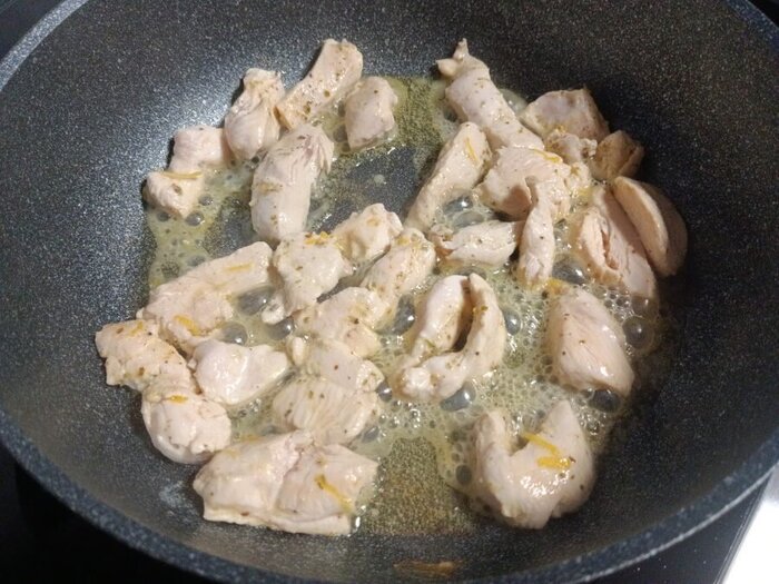 Немного обсушите курицу. Разогрейте сковороду и обжарьте курицу на сливочном масле.