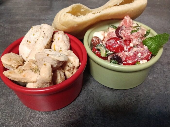 Представьте себе нежнейшую курицу в греческом маринаде, сочный и сладкий арбуз, соленые оливки, нежную фету, сладкие черри и свежий базилик.