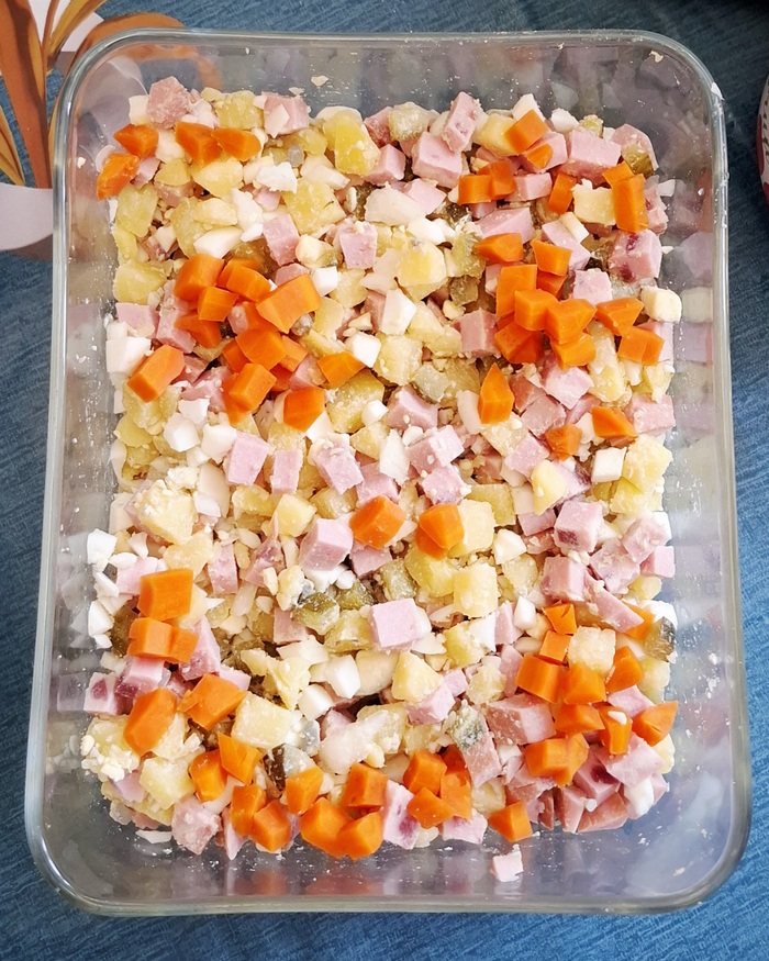 Вот мы и добрались до блюда, которому я не буду петь дифирамбы, здесь мне не хватило майонеза, солёные огурцы были не на мой вкус, а они обычно и задают вкусовой тон оливье. Салат не выкинули, потому что продукты в нём свежие, едоки на него нашлись, просто я не могу назвать его домашним, скорее это проходной салат из магазина.