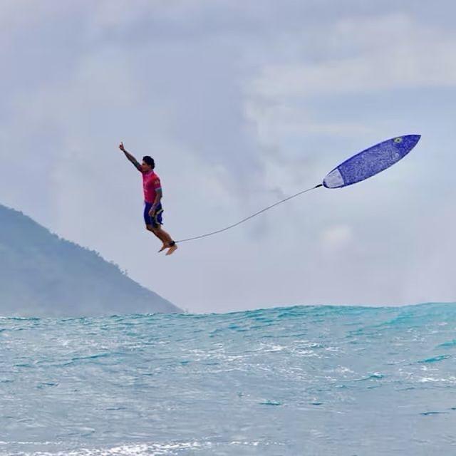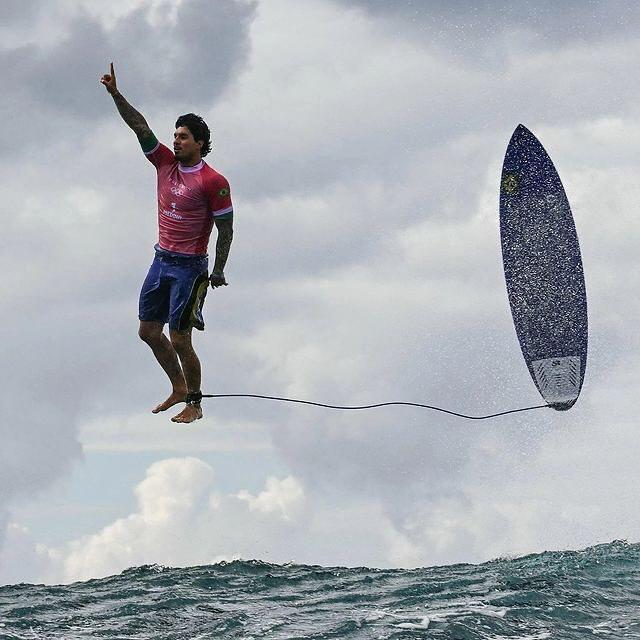 Габриэль Медина завис в воздухе после трюка на Олимпиаде в соревнованиях по сёрфингу — судьи поставили ему 9,9 балла из 10.