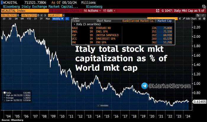 Говорят, Италия абсолютно развивающейся страны с точки зрения фондового рынка. Совокупная стоимость всех итальянских компаний, котирующихся на бирже, составляет всего 711 миллиардов долларов, что составляет всего 0,6% от мировой рыночной капитализации, несмотря на то, что доля Италии в мировом ВВП составляет 2,1%.