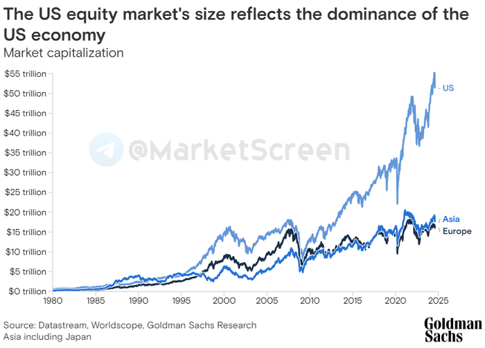 Вот так по мнению ГолдманСаков выглядит рыночная капитализация США, Европы и Азии (включая Японию).