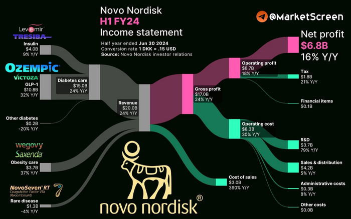 Выручка - 20 млрд $ (1 датская крона - 0,15 $). Выросла за год на 24%. Из них 10,8 млрд - тот самый Оземпик. В целом, линейка препаратов против диабета заносит 15 млрд $. В неё включают и Оземпик. Препараты отдельно против ожирения - 3,7 млрд $. И 1,3 млрд - прочие редкие болячки.