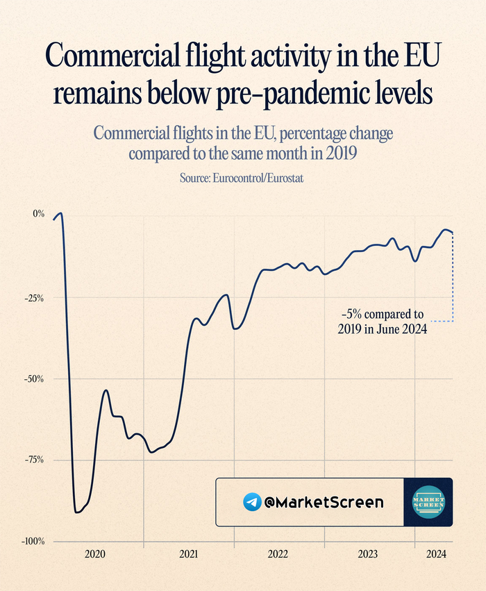 Воздушное сообщение в ЕС с трудом восстанавливается после пандемии. Количество коммерческих рейсов и пассажиров по-прежнему не превышает показателей 2019 года, существовавших до пандемии.