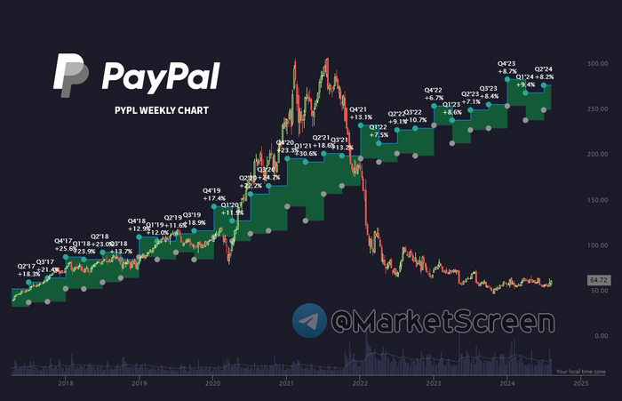 ПайПэл - это, конечно, что-то с чем-то. Адский пример того, как показатели выручки компании ну никак не влияют на стоимость акций компании.
