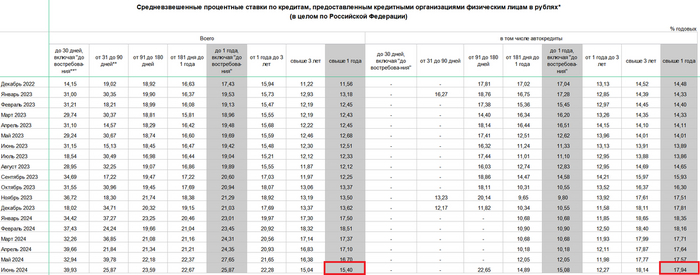 В целом по продуктам свыше 1 года средневзвешенная ставка в июне 2024 составила 15,4%. Если отдельно брать автокреды, то там 17,94%.